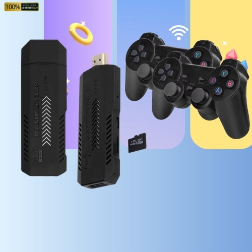 Découvrez la Mini Player Vintage, une clé HMDI 4K qui offre plus de 20 000 jeux à brancher directement sur un grand écran. Deux manettes sans fils sont inclues pour jouer avec vos amis ou votre famille.